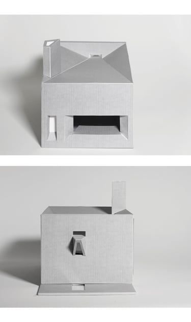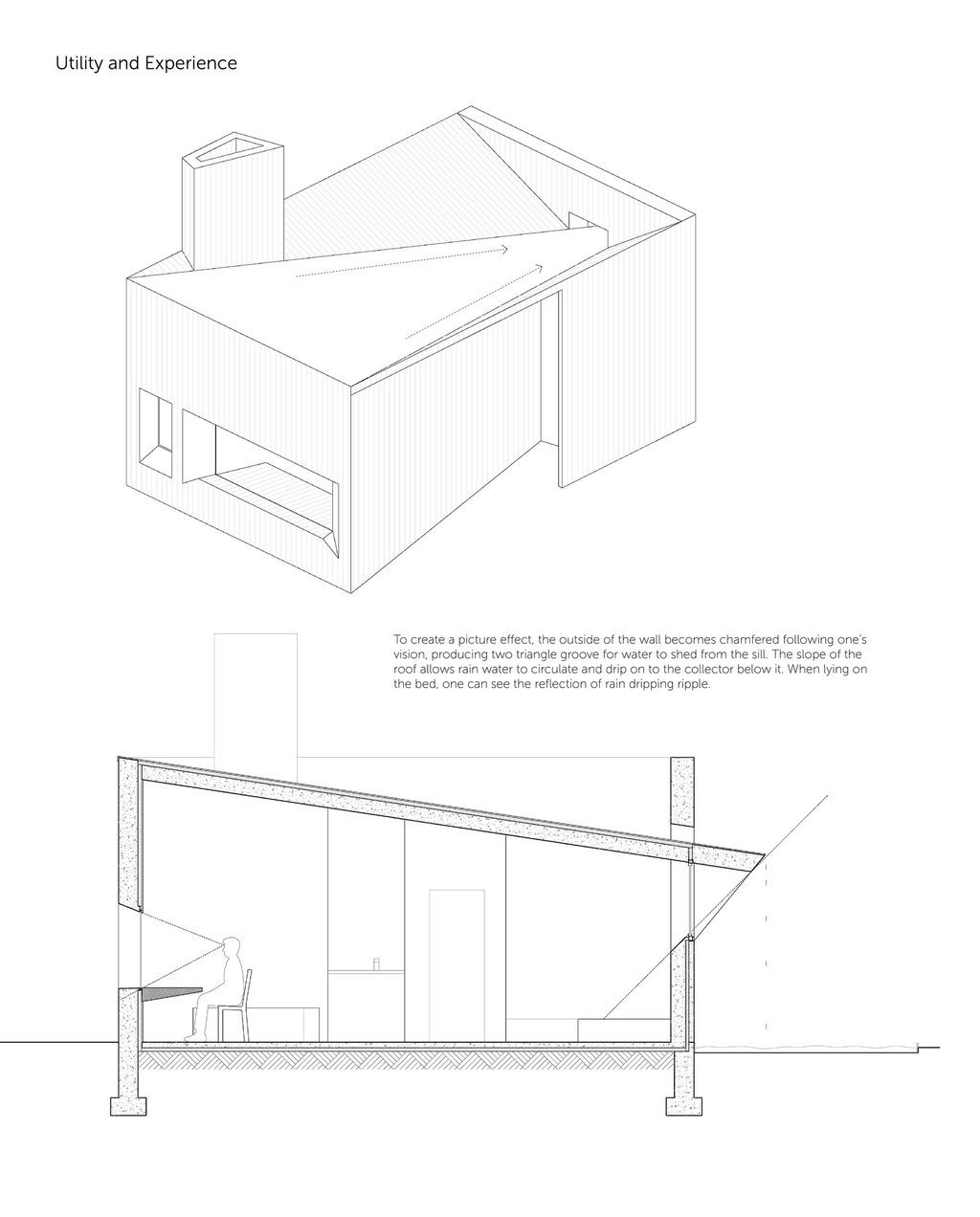 Inspired by Henry David Thoreau’s cabin in Walden, the project investigates how minimal spatial conditions—light, view, and enclosure—can support reflection and intimacy with nature. Two apertures anchor the design: one for writing, one for sleeping. While referencing the reductive clarity of Thoreau’s life and writings, the project is trying to create a connection between utility and poetics. Elements typically hidden—such as gutters and downspouts—are folded into the architecture as perceptual and experiential devices.